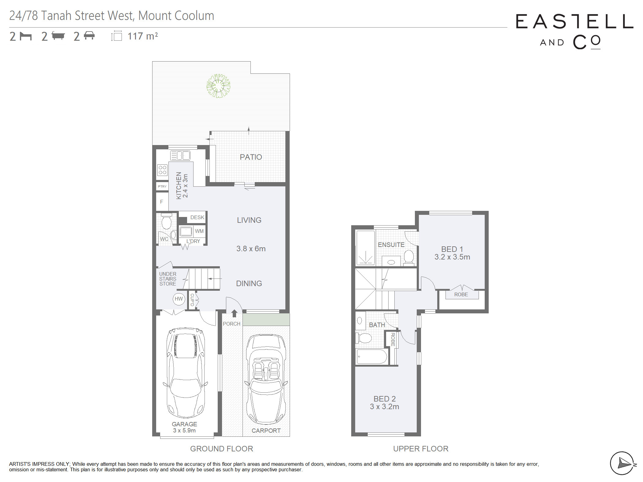 Upstairs, two generously sized bedrooms with built-in robes include a master complete with a private ensuite, while a central bathroom serves the second bedroom. Additional conveniences include a ground-floor powder room, Euro-style laundry, reverse-cycle air conditioning, a single remote garage with internal access, and an adjoining carport for additional parking.