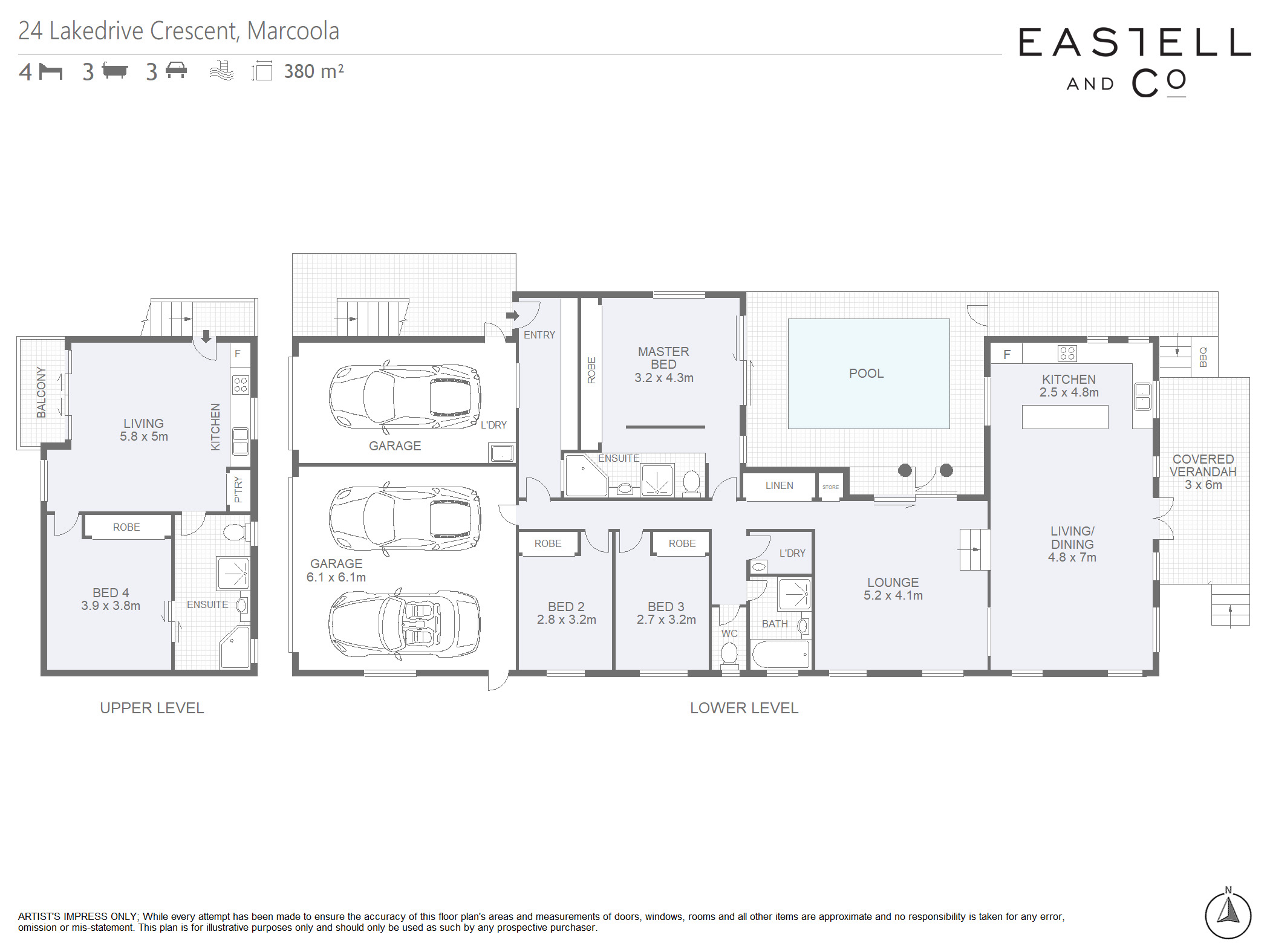 Accommodations are thoughtfully zoned, with three robed bedrooms set across the main level, including a king-sized master with full ensuite and pool views. A central family-sized bathroom and double garage complement the home, offering storage and secure access with further highlights including reverse cycle air conditioning and ceiling fans for added year-round comfort.